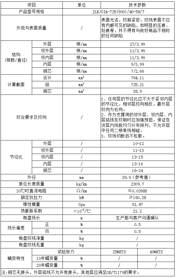 JLK/G1A-725(900)/40-58/7扩径导线技术参数表